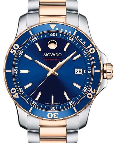 Movado Series 800 model 2600149. Swiss made quartz analog movement. Solid stainless steel case and bracelet with rose gold tone PVD coating. Uni-directional rose gold tone PVD bezel with blue color 60 minute insert. Blue dial. Sapphire crystal. Water resistant to 200 meters.