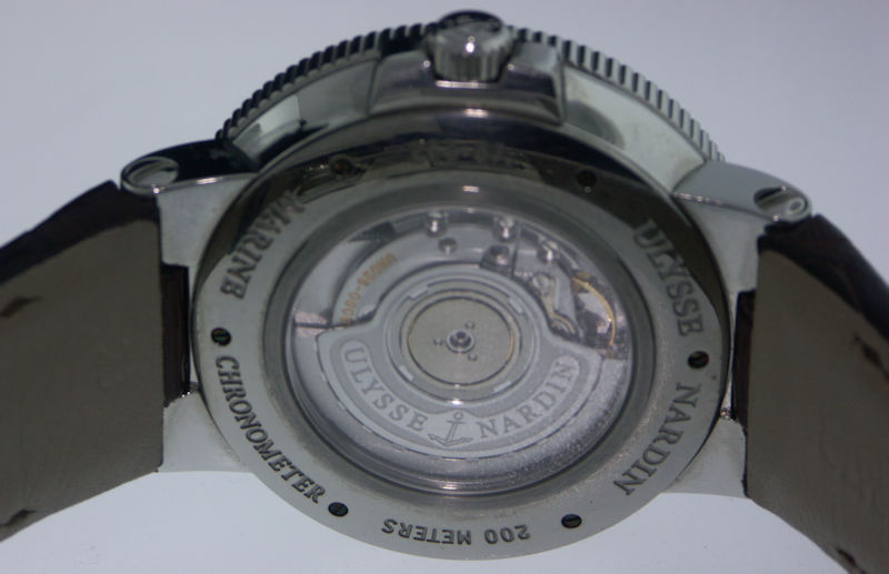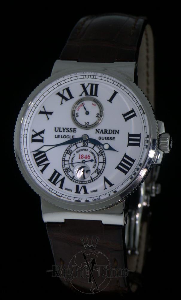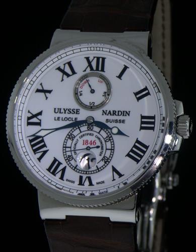 Ulysse Nardin Maxi Marine Chronometer, model 263-67/40. Ulysse Nardin Calibre UN-26 automatic movement with COSC Chronometer certification, date function, and power reserve indicator. Polished 43mm stainless steel case with coin-edge bezel. White dial with roman numerals and fire-blued hands. Brown alligator strap with a deployant buckle.