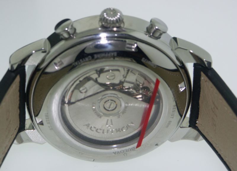 Accutron stainless steel Automatic Chronograph watch from Accutron Gemini Collection with 25 jewels self-winding mechanical Swiss ETA Valjoux 7750 chronograph movement, day/date calendar, exhibition case back and leather strap. Guilloche textured black color dial with Tachymetre scale.