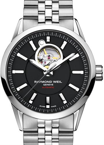 Raymond Weil Freelancer model 2710-ST-20001. Swiss automatic movement. Black dial with "open heart" - aperture to observe the balance wheel. Steel hands and markers. Sapphire crystal. Stainless steel case with bracelet. 100 meters water resistant.