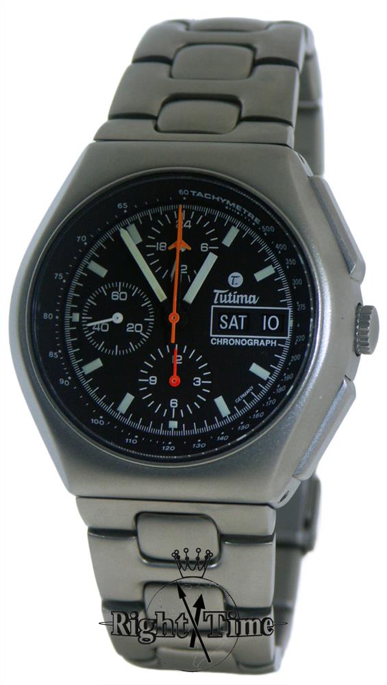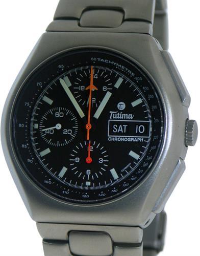 Tutima Military Air Force Chronograph model 760-03. This watch is powered by famous and no longer available LEMANIA Cal.5100 Swiss Automatic movement with chronograph, military 24 hour format hand, Day/Date calendar functions. Pure titanium case with screw-down crown. Black dial with Tachymetre scale, luminous hands and markers. Titanium watch bracelet with tri-fold deployment clasp with security flip-lock and over-the-wetsuit expansion. Water resistant to 200 meters.
