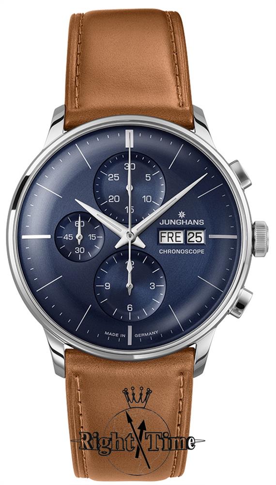 Junghans Meister Chronoscope Day-Date model 27/4526.01, Powered by automatic chronograph movement ETA7750. Stainless steel case with tan leather band. Blue dial, acrylic crystal.