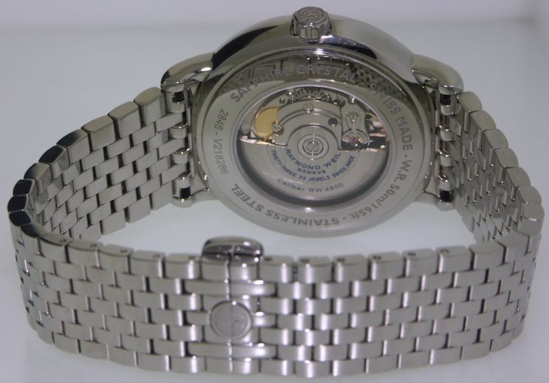 Raymond Weil Maestro model 2846-ST-00659. Swiss automatic movement. Silver tone textured dial with black Roman numerals, small seconds sub-dial at 9 o`clock, and date pointer hand at 3 o`clock. Blue color hands. Sapphire crystal. Polished stainless steel case and bracelet, 50 meters water resistant.