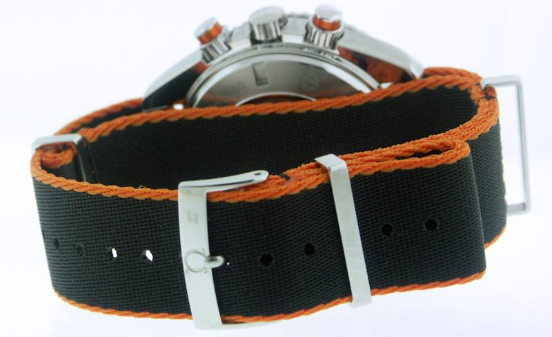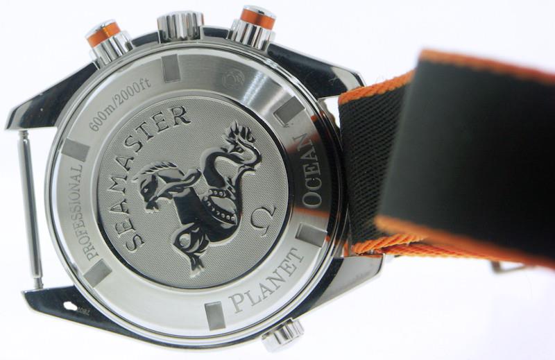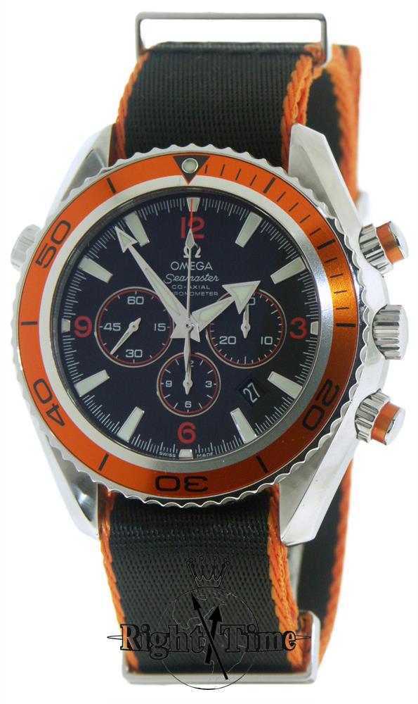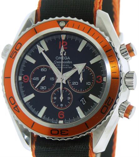 Omega Seamaster Planet Ocean factory reference 2918.50.82. Professional 600 meter diver in a modern 45.5mm solid stainless steel case. Omega Nato style strap. Uni-directional rotating bezel with orange 0-60 minute insert. Black dial with polished steel markers and hands. Omega Co-Axial calibre 3313 automatic movement with date and chronograph functions. Sapphire crystal.