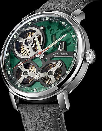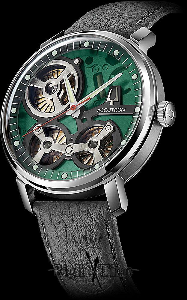 Accutron Spaceview 2020 Collection. Model 2ES6A005. Powered by Accutron proprietary electrostatic movement. Signature Accutron green open dial with black accents. Stainless steel case with gray leather band.