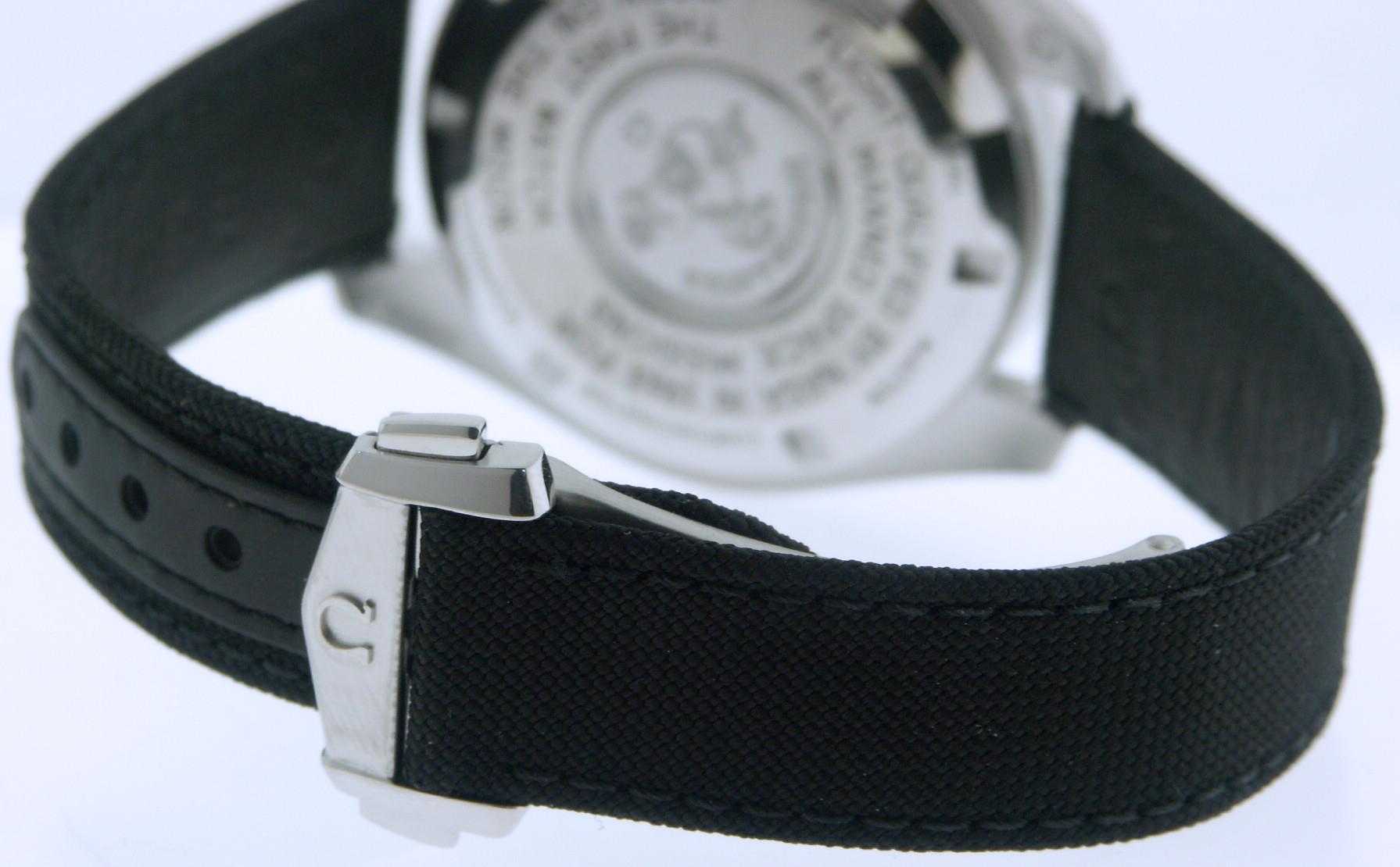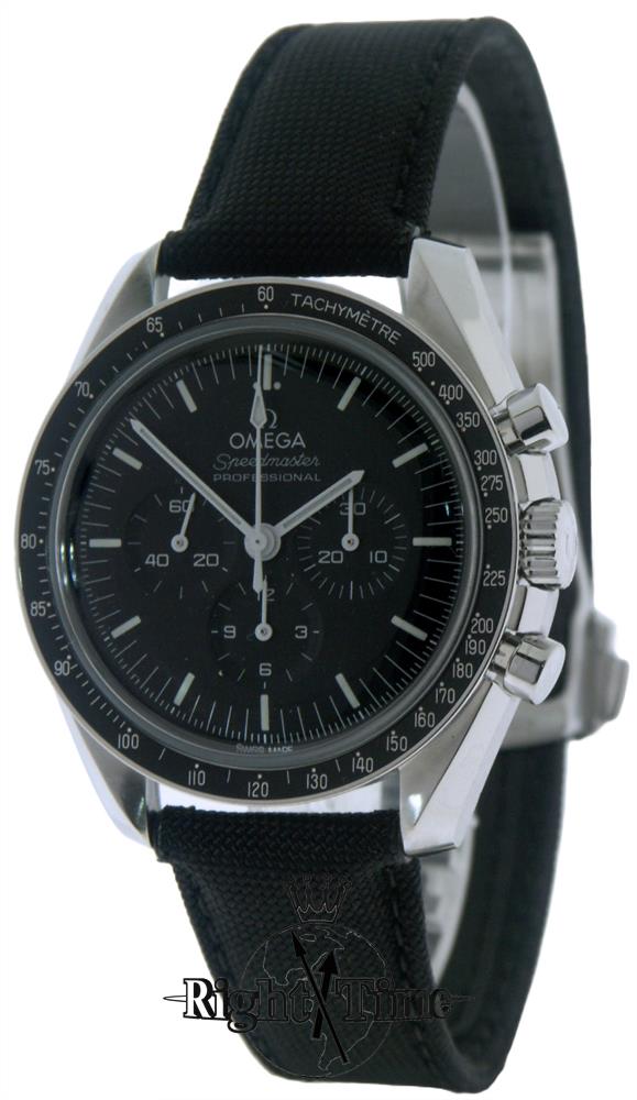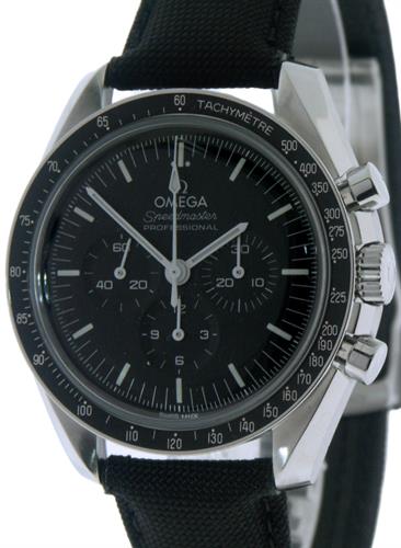 Omega Speedmaster MoonWatch professional 42mm factory model 310.32.42.50.01.001. Omega Caliber 3861 manual wind movement with chronograph function. Black dial with luminous hands and markers. Solid stainless steel case. Domed acrylic crystal. Black reinforced fabric strap with deployant clasp.