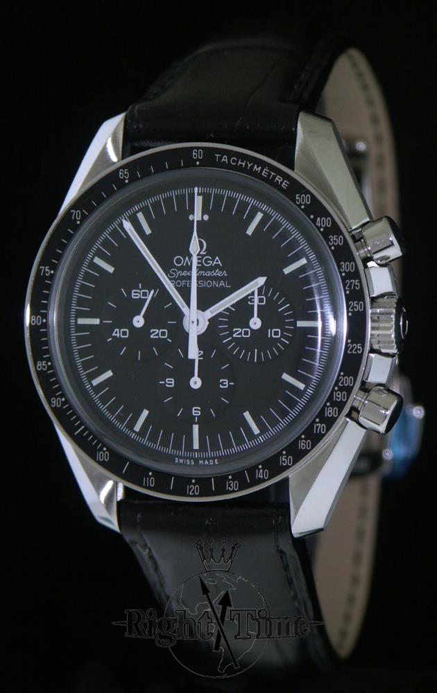 Omega "Speedmaster" Moonwatch powered by famous 18 jewel Lemania 1861 manual wind movement, steel 42mm case, hesalite crystal, black alligator leather strap, military nylon strap , loope and changing tool, housed inside beautiful commemorative black presentation box with plaque
