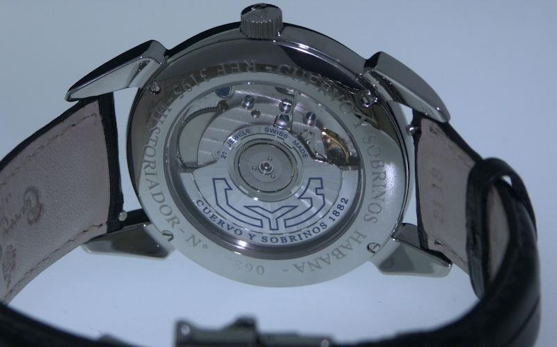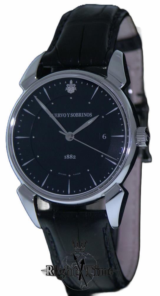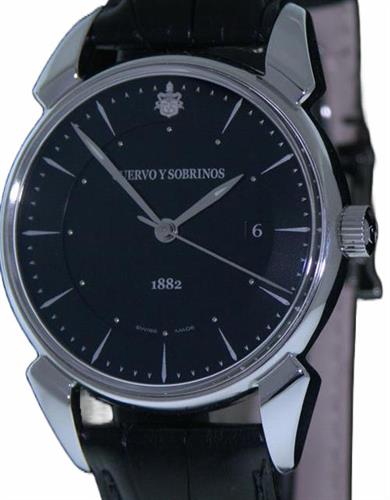 Cuervo Y Sobrinos Historiador Tradicion watch Model 3195.1CS.AR with central second hand. Classic and elegant thin automatic watch powered by ETA2892-2 in stainless steel round case with black alligator strap. Black dial with circular guilloche pattern chapter ring. Comes in unique cigar humidor box
