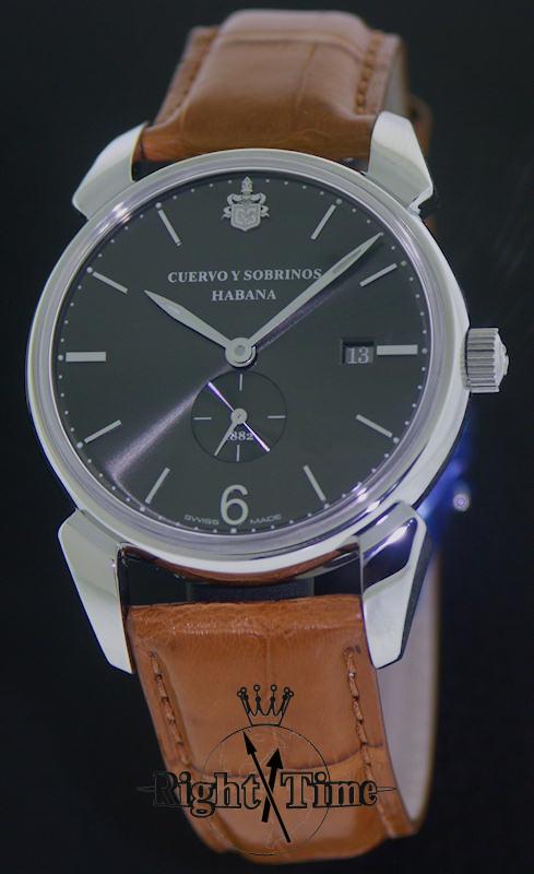 Model 3195.1GS. Classic and elegant automatic watch in stainless steel round case with tan alligator strap. Grey dial with date and small second sub-dial. Comes in unique cigar humidor box