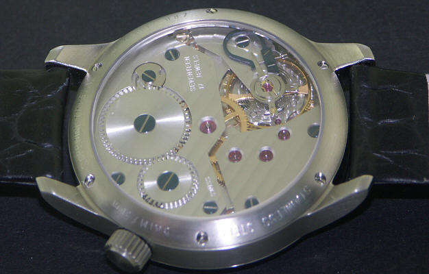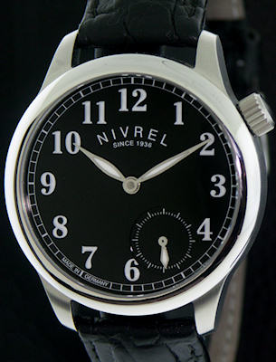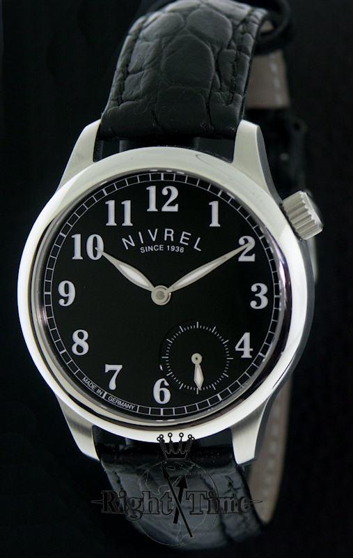 Nivrel Germany manual wind wrist watch powered by ETA 6498 movement with custom swan`s neck fine adjustment. Large 42mm steel 316L case with transparent back, black dial with luminous large Arabic numerals. Small seconds sub-dial at 5 o`clock position. Black leather watch strap.