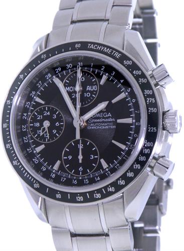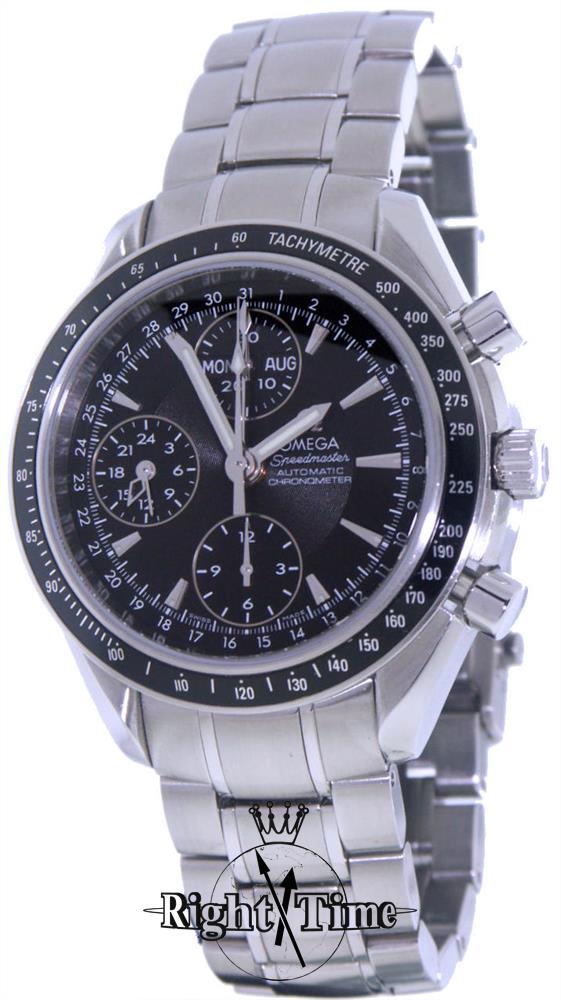 Omega Speedmaster 3220.50.00 black dial automatic triple calendar (day, date, month), chronograph with 24 hour indicator hand. All stainless steel case and band, with black Tachymeter bezel.