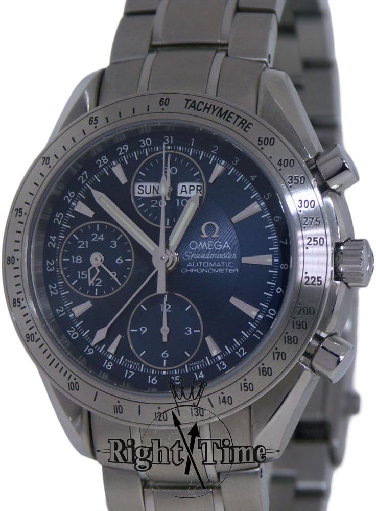 Omega Speedmaster model 3221.30.00. Omega Caliber 3606 automatic movement with chronograph and triple date functions. Blue dial with steel tone hands and markers. Domed sapphire crystal. All stainless steel case and bracelet with a fixed steel tachymeter bezel.
