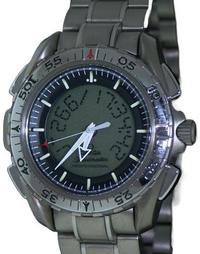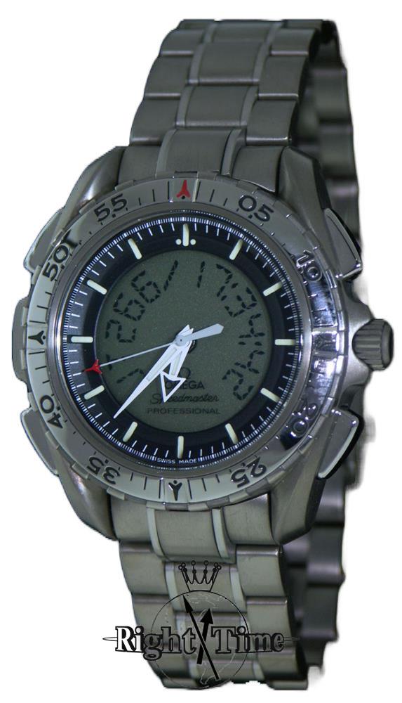 Omega Speedmaster X-33 first gen ana-digi Omega Cal.1666 Quartz movement. Satin finished 45mm titanium case with polished duo-directional 60 minutes bezel, black color dial with digital display, luminous hands and markers. Satin finished titanium watch bracelet with tri-fold deployment clasp.
