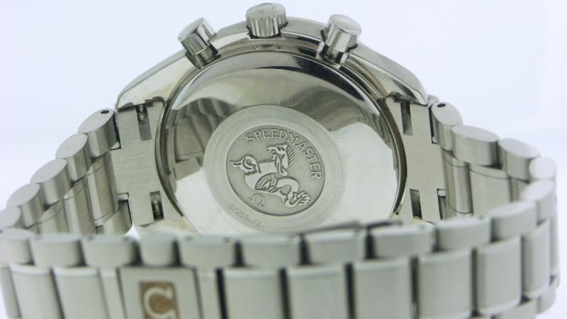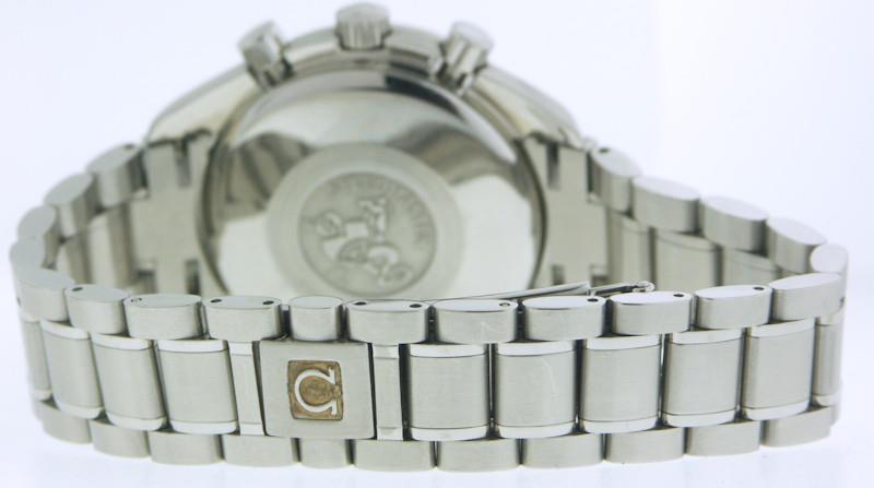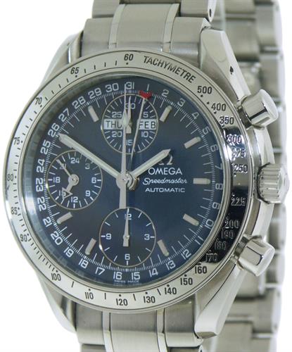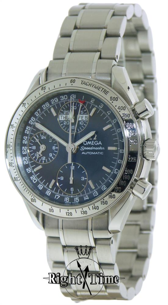 Omega Speedmaster Blue dial automatic triple calendar chronograph Cal.1151 with 24 hr hand. All stainless steel case and band, with polished Tachymetre bezel.
