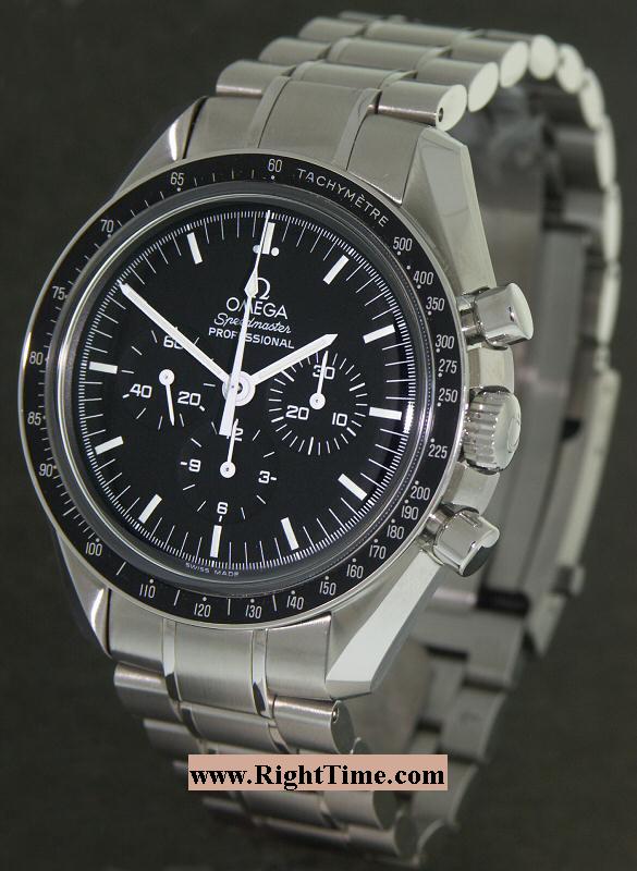 Omega Speedmaster Professional Moon watch. Famous Lemania based Omega 1861 manual-winding chronograph movement that was used on the first watch on the Moon. Steel case with black Tachymetre scale on the bezel. Black dial with seconds sub-dial, luminous hands and markers. Steel watch bracelet with tri-fold deployment clasp and spring release.