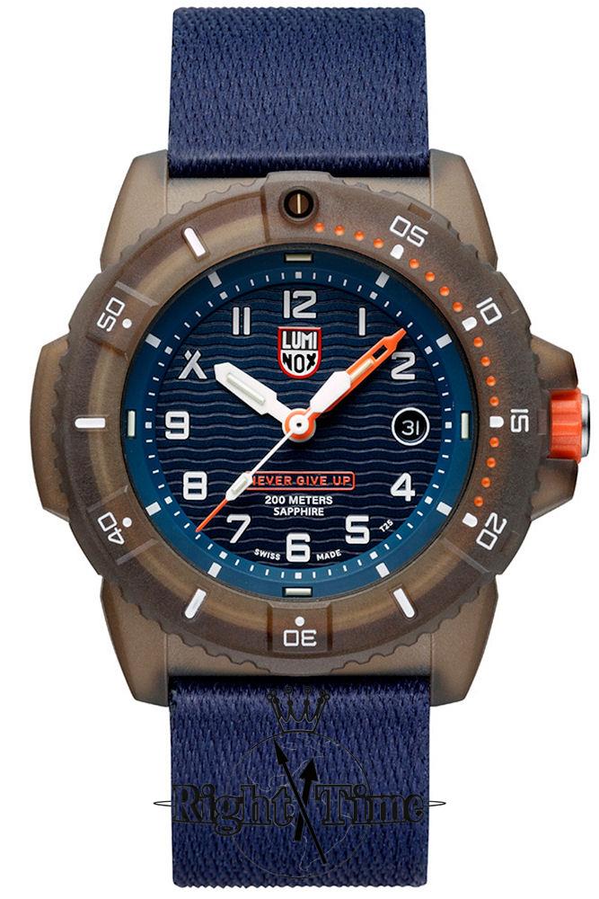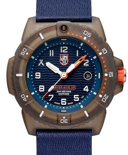 Luminox partners with legendary British adventurer Bear Grylls to bring the new "Bear Grylls Survival" series. Model 3703 features a Swiss Quartz analog movement. Grey CARBINOX case with a mineral glass crystal. Uni-directional bezel with 60 minute insert. Blue textured dial with tritium hands and markers. blue rubber strap with tang style buckle. Diver rated to 200 meters.