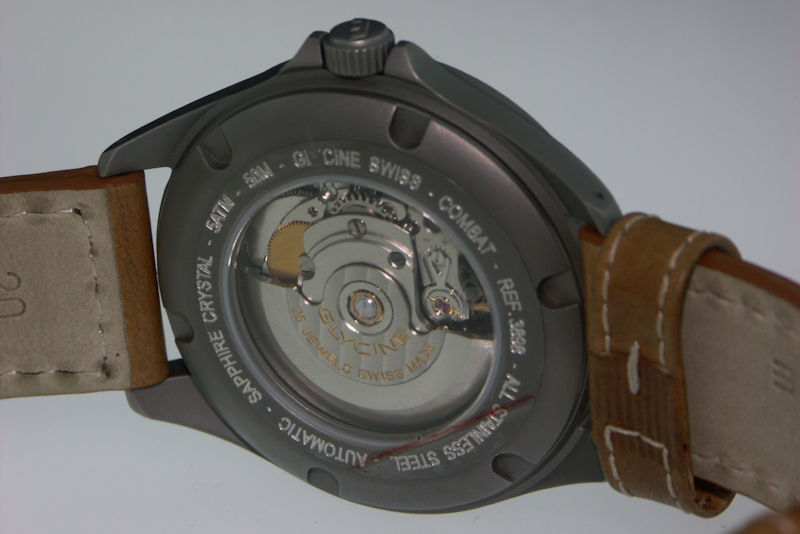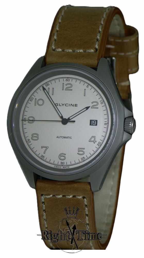 Glycine Combat 7 model 3898-14T-LB7. Swiss made Automatic ETA movement. Sandblasted stainless steel case. White dial with luminous Arabic markers and hands. Tan leather strap with contrasting white stitch. Sapphire crystal.