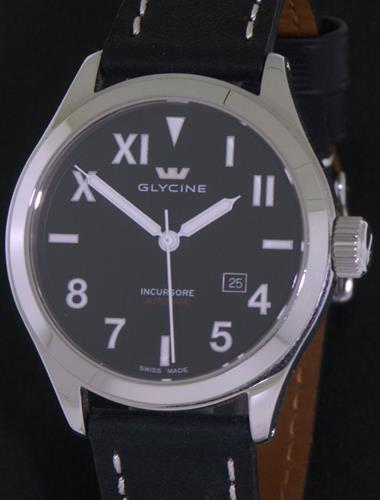 Glycine Incursore. Swiss automatic movement. Polished stainless steel 44mm case and sapphire crystal. Black "California" dial with both roman & Arabic numerals. Black leather strap with white stitching.