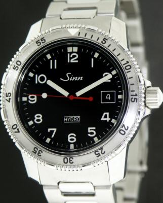 Super water resistant, silicone filled, Sinn "Hydro" quartz divers model with black easy to read luminous dial and solid steel bracelet.