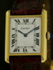 Cartier "Tank" Style, 20 micron gold electroplated case, 17 jewel manual wind Swiss made movement, classic white dial with black Roman numbers.