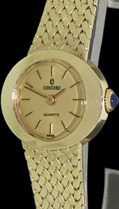 Concord ladies 14kt solid gold watch with quartz movement. Champagne color dial. Blue cabochon stone crown.