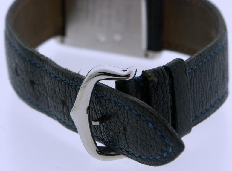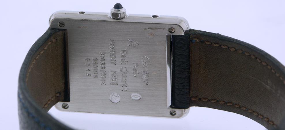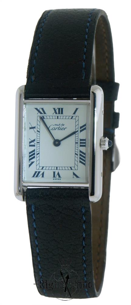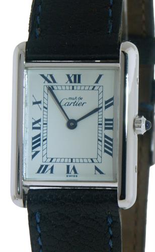 Must De Cartier "Argent .925" model 4313, powered by Swiss made quartz movement. 925 sterling silver 23mm rectangular tank style case, white dial with blue Roman numerals and blued hands