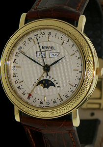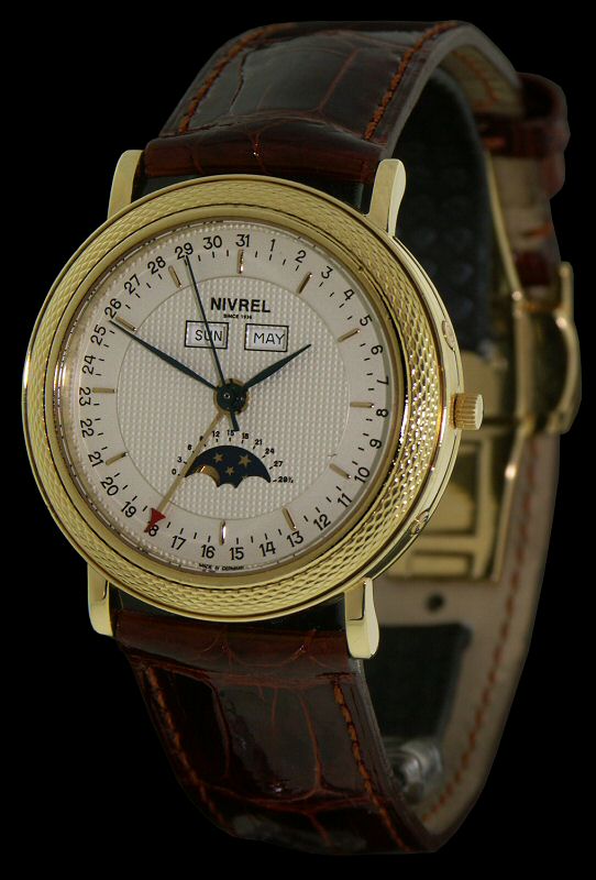 Nivrel "JAGER" tripple date dress automatic watch with Moon Phase indicator, Date Pointer hand, Day/Month window calendar display functions. Swiss Mechanical Automatic ETA 2892-2 base movement with hand enhanced Cotes de Geneve burnished plates. Guilloche textured white color dial. Solid 18KT yellow gold case with decorated bezel, observation case back and brown crocodile watch band.
