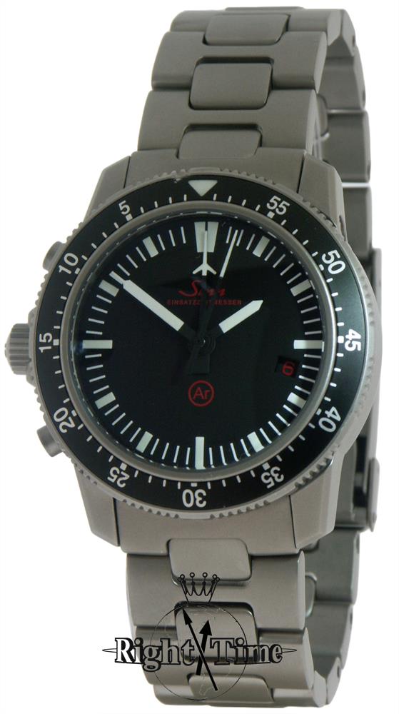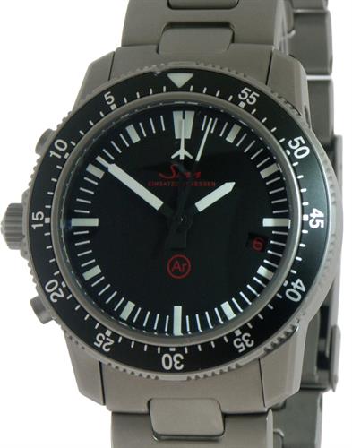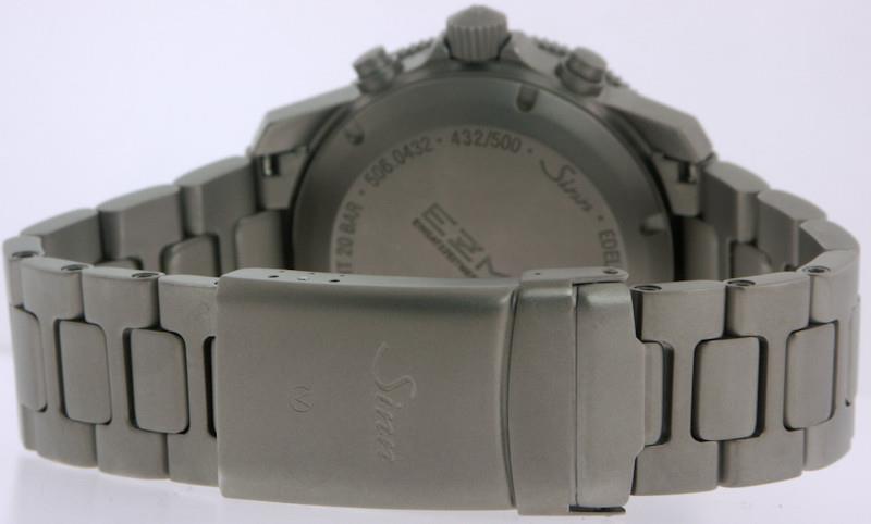 Sinn EZM1.1 Einsatzzeitmesser, Special edition watch for German border patrol, made of super tough Tegimented stainless steel, left side crown, with argon case capsule. Powered by CZ-01 automatic chronograph movement developed in-house by Sinn, based on Valjoux 7750, but mimicking the functions of Lemania 5100. Comes in a kit with an extra black leather strap, Limited edition of 500