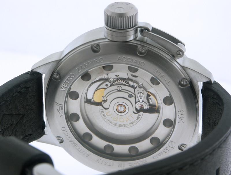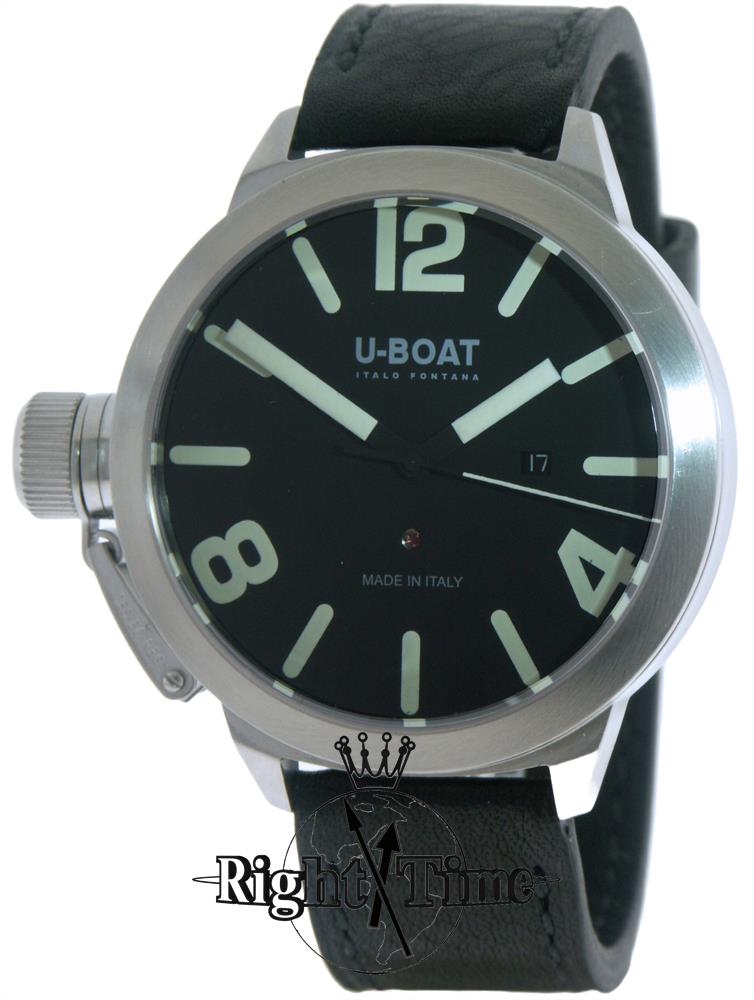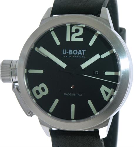 U-Boat Classico model 5570. Oversized 53mm stainless steel case with raised sapphire crystal. Black dial with luminous hands and hour markers. Swiss made ETA 2824 automatic movement. Black leather strap. Water resistant to 100 meters.