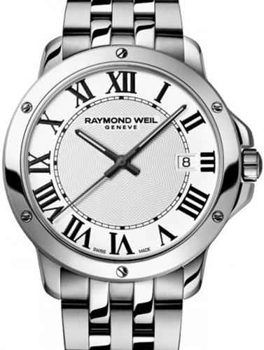 Raymond Weil Tango model 5591-ST-00300. Quartz movement with date. White textured dial with Roman markers. Sapphire crystal. 39mm stainless steel case with bracelet. 100 meters water resistant.