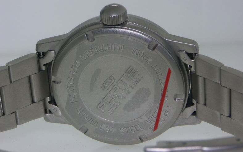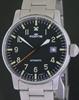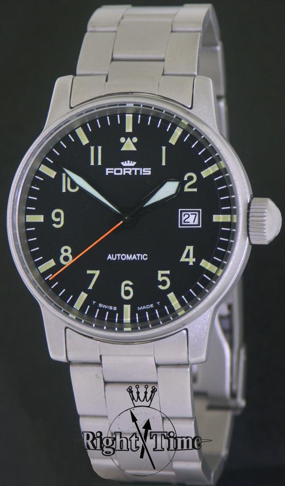 Fortis Pilot Edition model 595.10.46.1 with a 40mm satin finish, solid stainless steel case & bracelet. Black pilot style with contrasting green tritium numbers and large luminous, very visible hands. 200 meters water resistant.