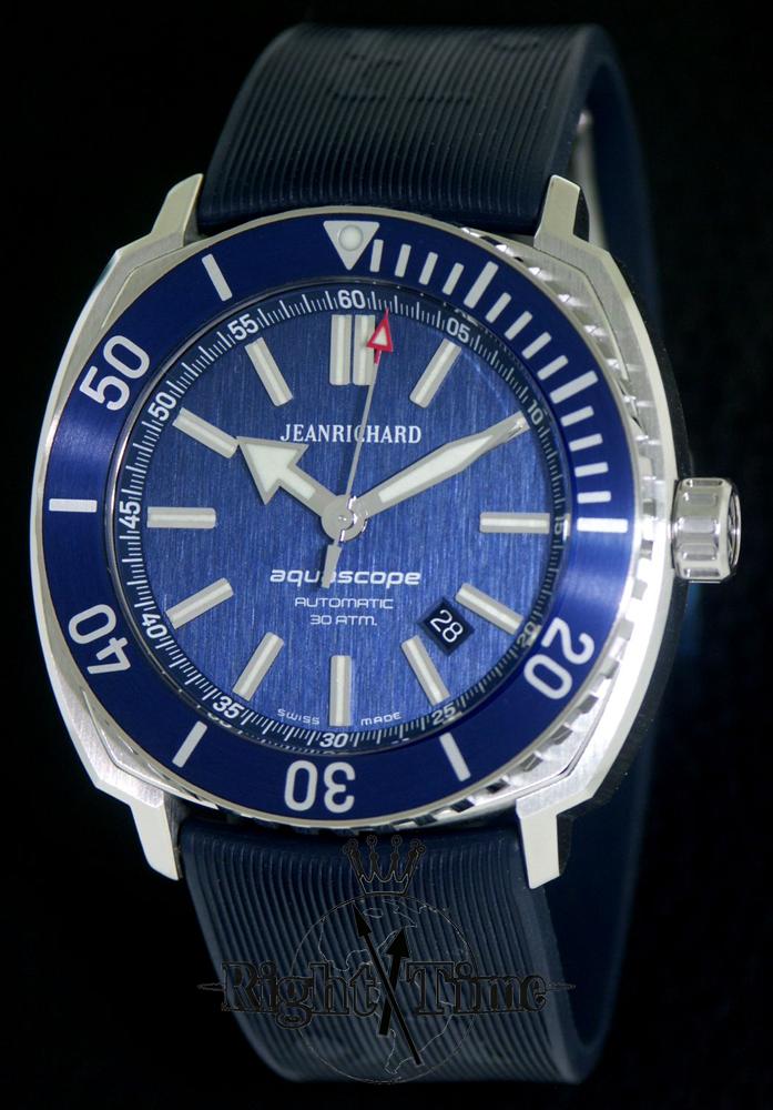 Swiss made JeanRichard Aquascope 60400-11D401-FK4A diver model powered by JeanRichard JR60 automatic movement. Stainless steel polished and satin finished original design case, joining cushion shaped base with round bezel, screw-down crown and blue 0-60 bezel insert. Blue color eloxed textured aluminum dial, extra large luminous hands and markers. Blue rubber watch strap. Water resistant to 300 meters.