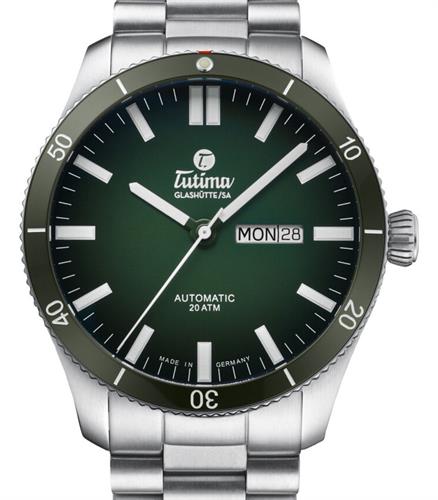 Tutima Glashutte Grand Flieger Airport Automatic wrist watch model 6106-04. Automatic movement Cal. Tutima 330 with day/date calendar. Stainless steel case with green bi-directional rotating 0-60 bezel, screw-down crown and skeleton case back. Sapphire crystal on front and back. Green dial with luminous hands and large markers. Water resistant to 200 meters.