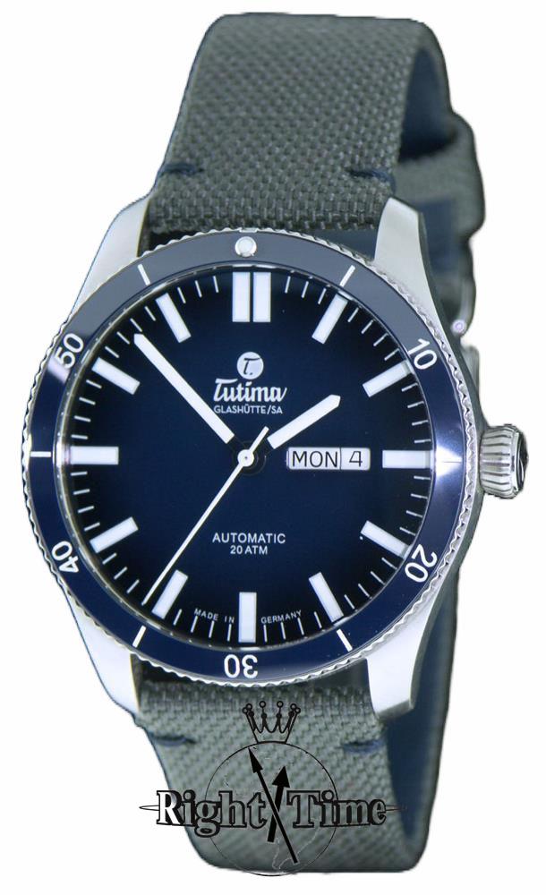 Tutima Glashutte Grand Flieger Airport Automatic wrist watch model 6106-01. Automatic movement Cal. Tutima 330 with day/date calendar. Stainless steel case with blue bi-directional rotating 0-60 bezel, screw-down crown and skeleton case back. Sapphire crystal on front and back. Blue dial with luminous hands and large markers. Water resistant to 200 meters. Gray Cordura strap