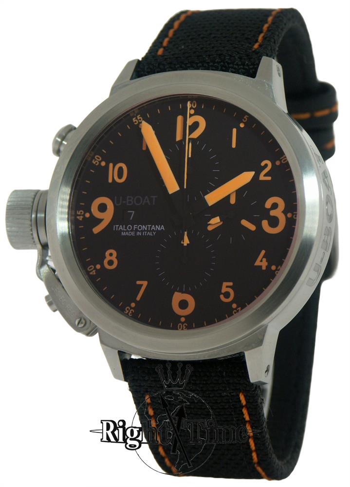 Italo Fontana U-BOAT Flightdeck model 6119. Swiss made Valjoux/ETA 7750 automatic chronograph movement. Satin finished stainless steel case with screw down oversized crown guard. Black dial with bright orange luminous hands and markers. Sapphire crystal. Water resistant to 100 meters. Black/orange Kevlar strap made by Hadley Roma.