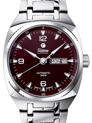 Tutima Glashutte Saxon One M Automatic wrist watch model 6121-01. Automatic movement Cal. Tutima 330 with day/date calendar. Stainless steel case with the three-dimensional, pyramid-shaped design, screw-down crown and skeleton case back. Sapphire crystal on front and back. Brown dial with luminous hands and markers. Water resistant to 100 meters.