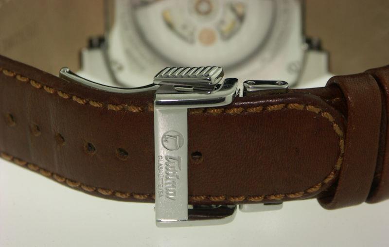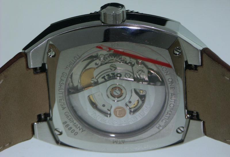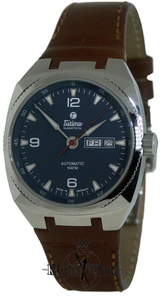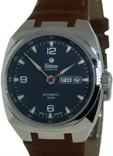 Tutima Glashutte Saxon One M Automatic wrist watch model 6121-04. Automatic movement Cal. Tutima 330 based on ETA2836-2 with day/date calendar. Stainless steel case with the three-dimensional, pyramid-shaped design, screw-down crown and skeleton case back. Sapphire crystal on front and back. Blue dial with luminous hands and markers. Water resistant to 100 meters.