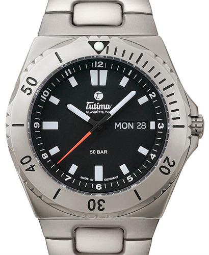 Tutima Glashutte M2 Seven Seas wrist watch model 6151-02. Automatic movement Cal. Tutima 330 with day/date calendar. Titanium case and bracelet. Screw-down crown and case back. Sapphire crystal. Black dial with luminous hands and markers. Water resistant to 500 meters.