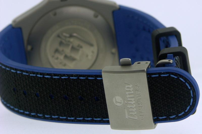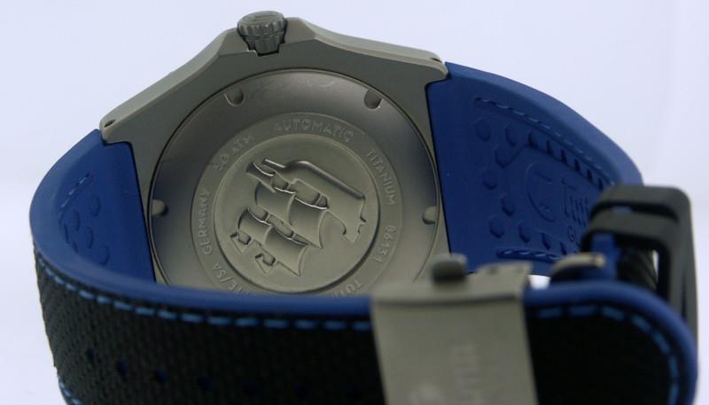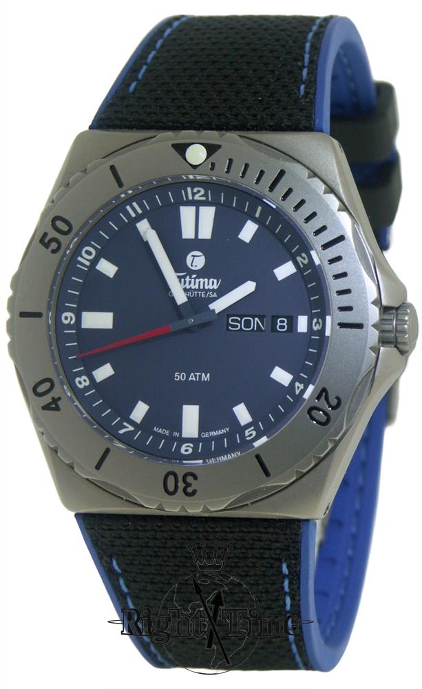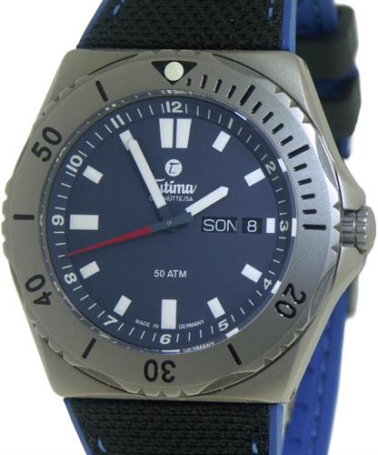 Tutima Glashutte M2 Seven Seas wrist watch model 6151-03. Automatic movement Cal. Tutima 330 with day/date calendar. Titanium case on a kevlar/rubber strap with a titanium deployant clasp. Screw-down crown and case back. Sapphire crystal. Blue dial with luminous hands and markers. Water resistant to 500 meters.