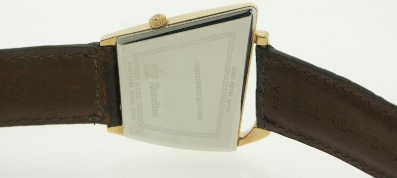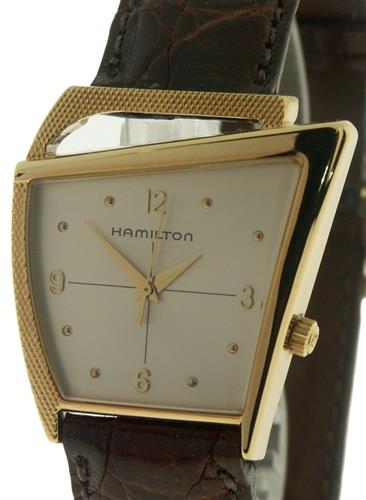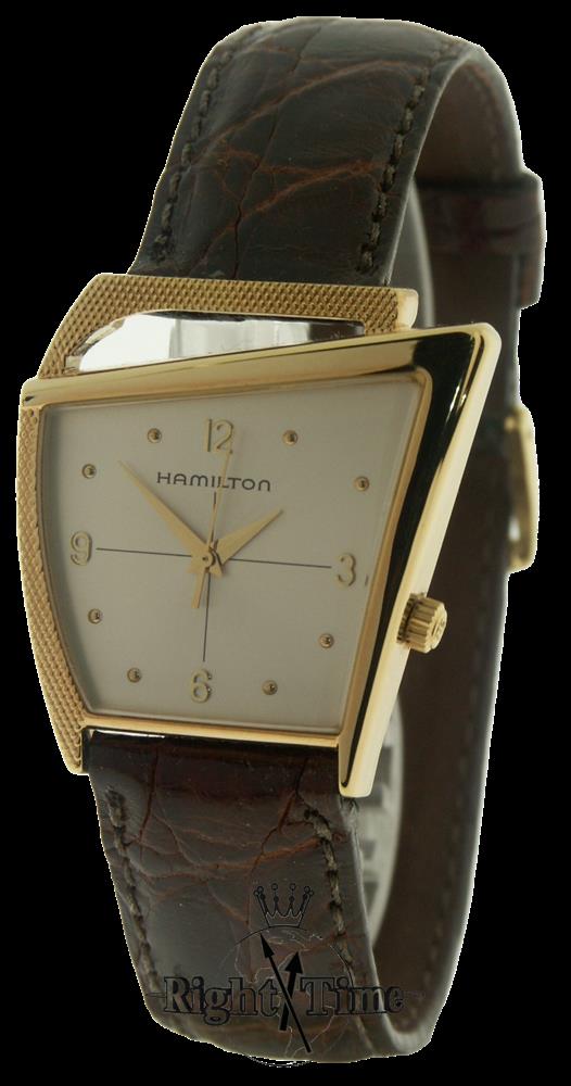 Hamilton Flight II model 623016. Uniquely shaped gold plated steel case. Silver dial with gold tone hands and markers. Mineral glass crystal. Brown crocodile leather strap.