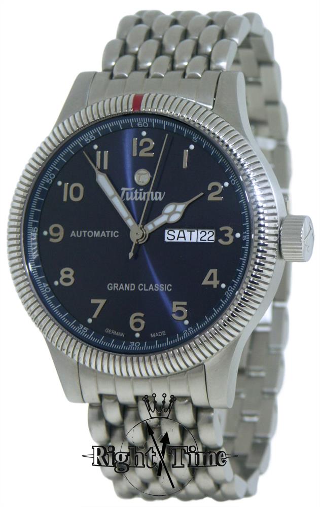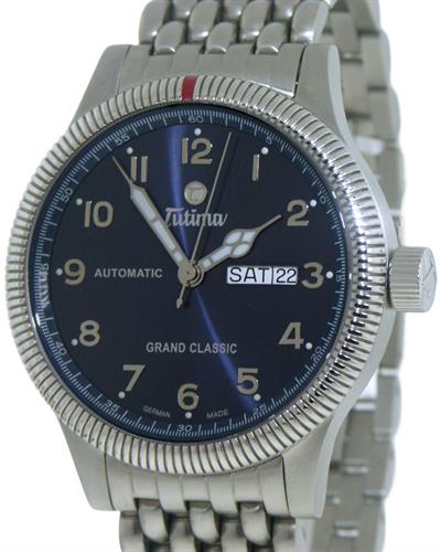 Tutima Grand Classic automatic wrist watch model 628-04. ETA Cal. 2836-2 Swiss Automatic movement with day/date calendar. Stainless steel 43mm case with bi-directional coin edge style rotating bezel, screw-down crown and skeleton case back. Gorgeous blue dial with Arabic numerals and luminous hands. Stainless steel watch bracelet.