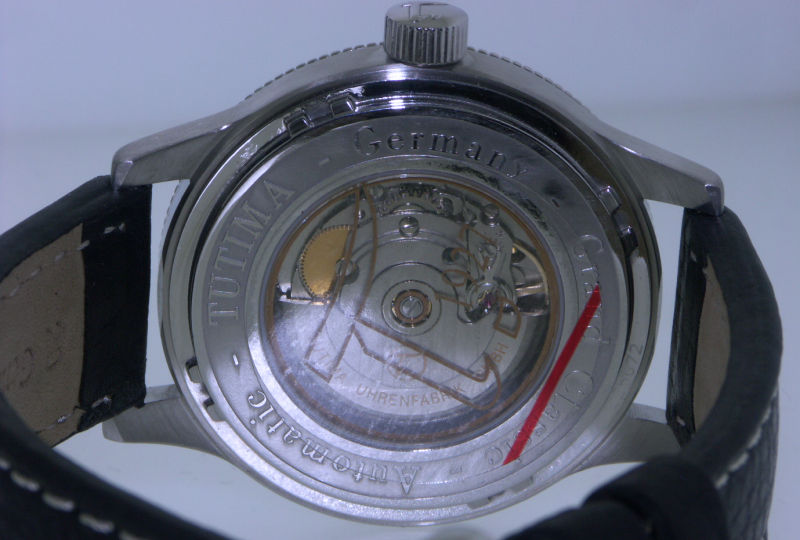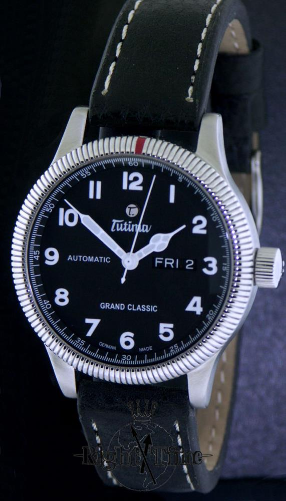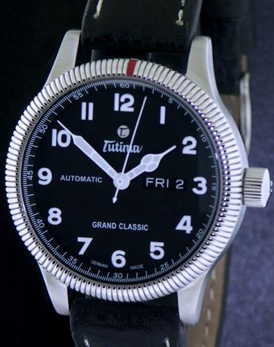 Tutima Grand Classic automatic wrist watch model 628-01. ETA Cal. 2836-2 Swiss Automatic movement with day/date calendar. Stainless steel 43mm case with bi-directional coin edge style rotating bezel, screw-down crown and skeleton case back. Black dial with Arabic numerals and luminous hands. Black leather watch band.