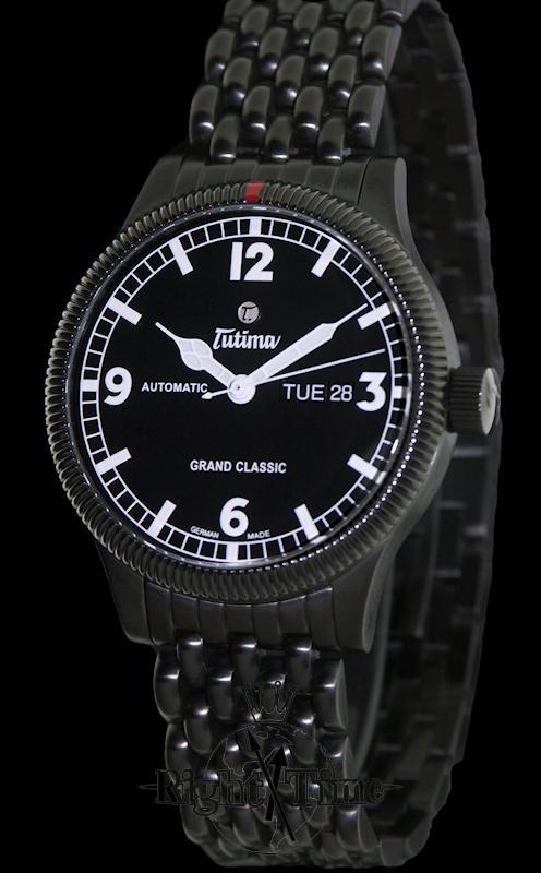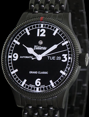 Tutima Grand Classic Flieger automatic wrist watch model 628-12. ETA Cal. 2836-2 Swiss Automatic movement with day/date calendar. Hardened steel and black PVD coated 43mm case with bi-directional coin edge style rotating bezel on metal 7 link black bracelet, screw-down crown and observation caseback. Jet black dial with Arabic numerals and large luminous hands.