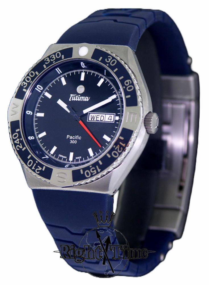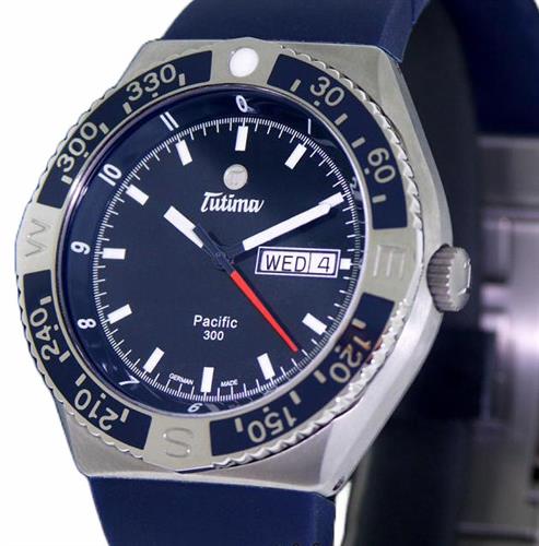 Tutima Pacific 300 model 629-17 from Tutima Military collection. ETA Cal. 2836-2 25 jewels Swiss Automatic movement with Day/Date calendar. Titanium case, unidirectional ratchet bezel, sapphire crystal. Blue color dial and bezel. Blue rubber strap. Water resistant to 30 bar.