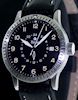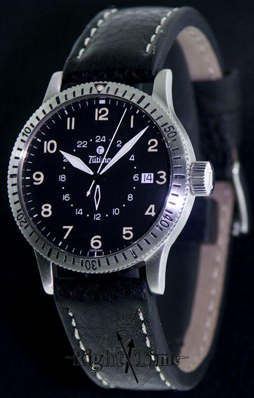 German made Tutima automatic wrist watch 634-01 from Tutima FX UTC Series. Powered by ETA Cal. 2893-2 Swiss Automatic movement with date calendar and Second Time Zone indicator. Stainless steel case with bi-directional 0-60 rotating bezel, screw-down crown and observation case back. Black dial with luminous hands and Arabic numerals. Black leather watch band.