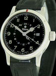 Tutima Flieger UTC wrist watch. ETA Cal. 2893-2 Swiss Automatic movement with date calendar and Second Time Zone indicator. Stainless steel 38.5 mm case with bi-directional coin edge style rotating bezel, screw-down crown and skeleton case back. Black dial with Arabic numerals and luminous hands. Black leather watch band. Consigned timepiece.