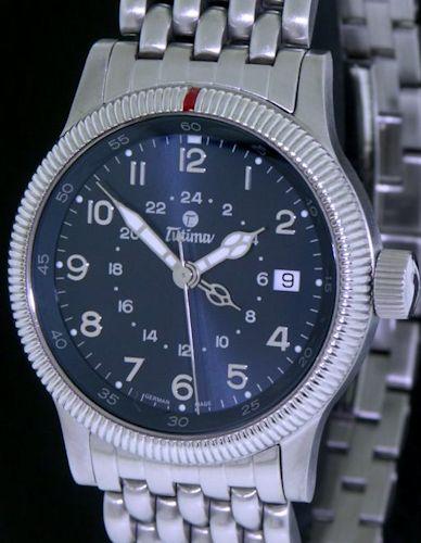 Blue dial German Flieger UTC two time zone indicator model by Tutima. Powered by ETA 2893-2 21 jewels automatic movement.