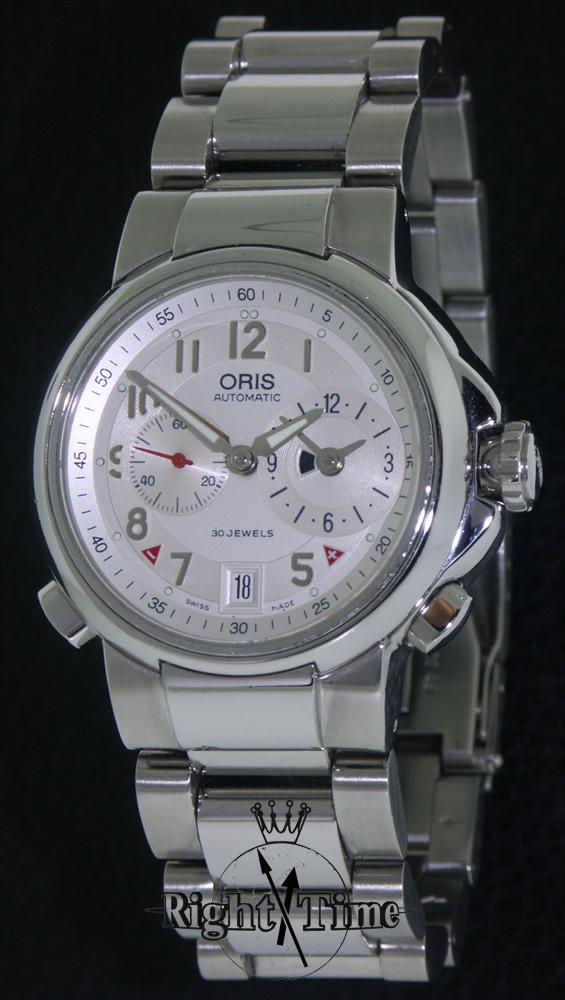 Oris Worldtimer watch from Oris Classic Collection. Swiss made Oris Cal.690 30 jewels, based on ETA 2836-2 automatic movement, stainless steel case with silver guilloche dial and applied numerals with Second Time Zone indicator and date calendar, observation case back, stainless steel watch band.