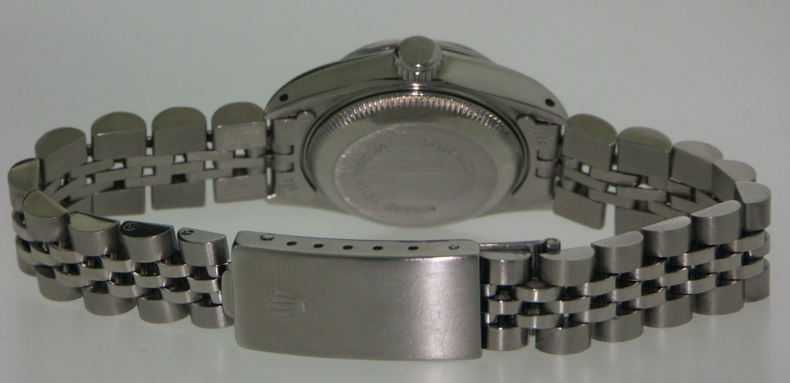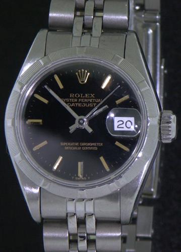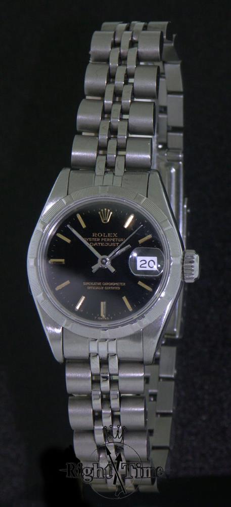 Rolex Oyster perpetual datejust, model 69190. Ladies 26mm stainless steel case with steel jubilee style bracelet. Black dial with polished markers and hands. Raised sapphire crystal. Rolex Cal 2135 automatic movement. Circa 1984.
