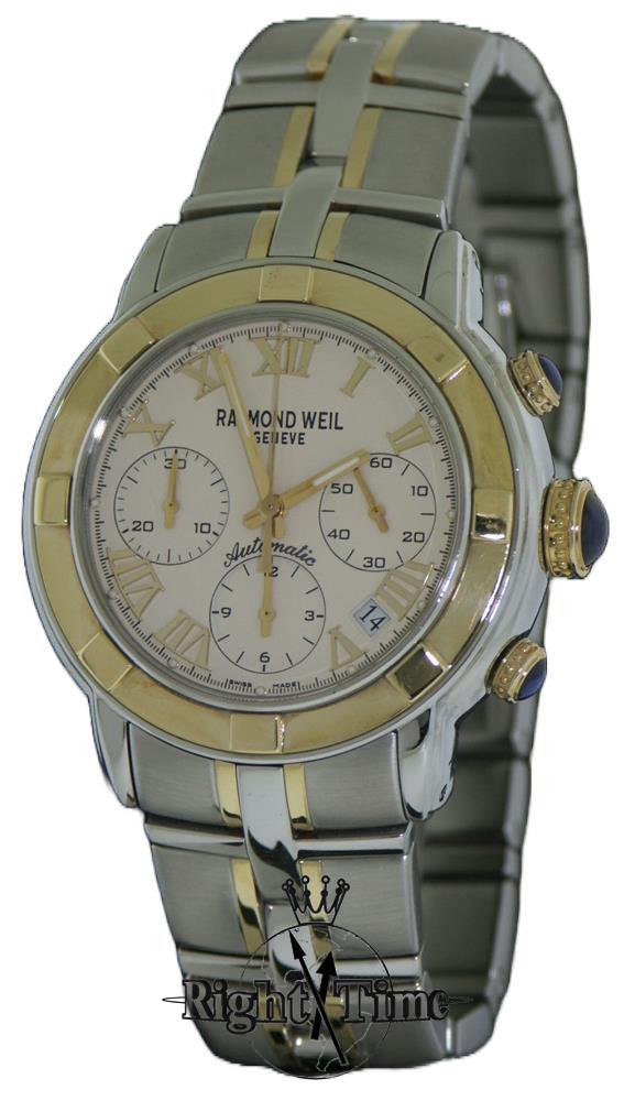 Raymond Weil Parsifal model 7240-STG-00308. Swiss automatic chronograph movement. Ivory dial with yellow gold tone Roman numerals and date calendar. Sapphire crystal. Stainless steel case with solid 18Kt yellow gold bezel and steel and 18kt gold bezel. 100 meters water resistant.